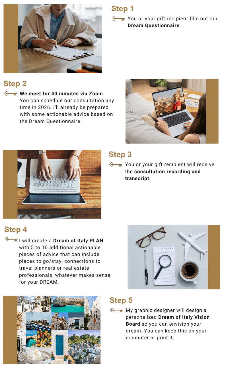 So many have a Dream of Italy but aren’t sure what to do to make it a reality. Let’s face it, planning a trip to Italy or even a move can feel incredibly daunting. Italy is so full of gorgeous and exciting places that it can feel paralyzing to decide how to craft a dream trip itinerary or where to move. Or to figure out the next right step to make any Italian dream – an extended stay, buying a home, learning Italian, retiring in Italy – come true.