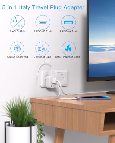 【5 in 1 Italy Power Adapter】- The Italy plug adapter provides 2 standard Amercian outlets, Max Capacity Up to 2500 Watt (max 250 Volt, 10 A); 3 USB Ports can charge up to 3.1A, allowing you charge 5 devices simultaneously. ideal for cell phone, tablet, power bank and other electrical chargers, ideal for Cell Phone, Laptops, Camera, Power Bank ect