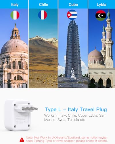 【US to Italy Plug Adapter】- This Italy travel plug adapter compatible with most overseas countries such as Italy, Chile, Cuba, Eritrea, Ethiopia, Lybia, San Marino, Syria, Uruguay, Vatican City. (Note: Some hotel may need 2 Prong TYPE C European travel plug adapter, please check before travel)